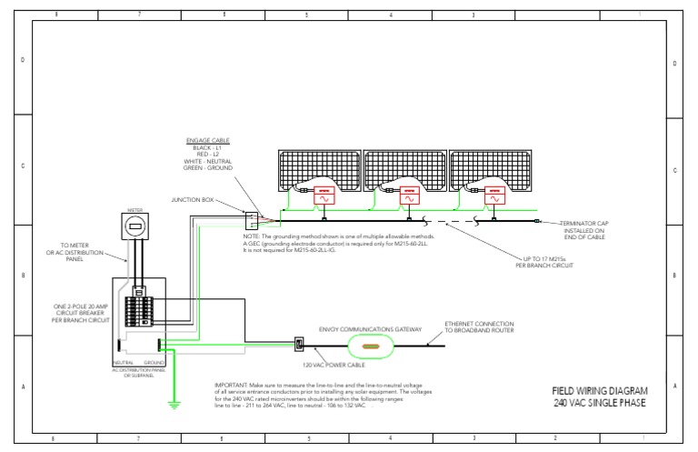 Once you grow beyond about 10 panels the scales start to tip in favor of solaredge hd wave systems as the more cost effective option. Individual circumstances and compatibilities should always be taken into account when selecting the right solar inverter for any given installation. The iq7 package costs 158 per panel which is great if you want to start small and ease your way into solar. The power coming from the micro inverters is ordinary single phase 240 volt 60 cycle ac house power a 208volt 3 phase option is also available. Make sure to measure the line to line and the line to neutral voltage. 8 7 6 5 4 3 1 8 7 6 5 4 3 2 1 d c junction box neutral ground ac distribution panel or subpanel one 2 pole 20 amp circuit breaker per branch circuit iq envoy to meter or ac distribution panel q cable black l1 red l2 terminator cap installed on end of cable important.
