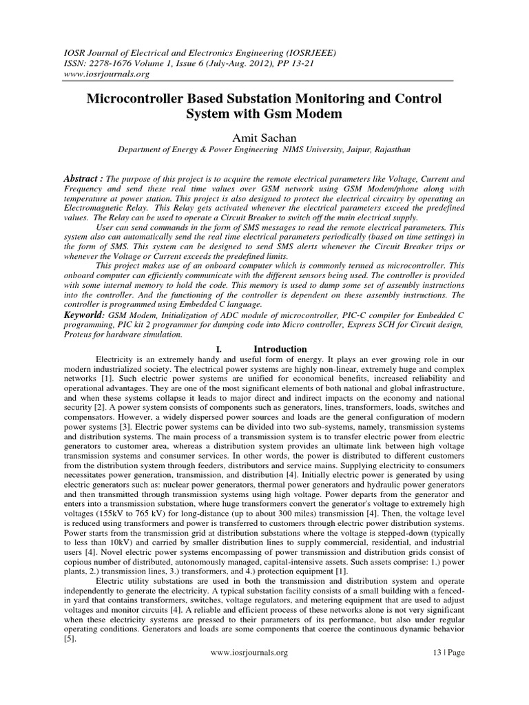 1 amit sachan microcontroller based substation monitoring and control system with gsm modem issn. Gsm or global system for mobile communications projects are based on one of the emerging technology of the century. It transports device protocols transparently over the network through a serial interface. It deals with design of a stand alone embedded system that can monitor and control several devices remotely irrespective of distance limitations. The purpose of this project is to acquire the remote electrical parameters like voltage current and frequency and send these real time values over gsm. Our project microcontroller based substation monitoring and control system with iot module.
