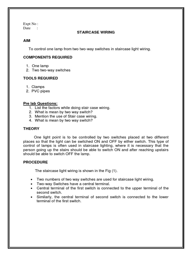 Special types of stairs include escalators and ladderssome alternatives to stairs are elevators also. This type of wiring is used in bed rooms to switch onoff the lamp from two sources at the bed side and at switchboard. Two way switch 5a 230 v 2 nos. A stair case wiring can be used only for human comfort. In this article simple two way light switch connection described with neat circuit diagram and wiring details. This type of wiring usually use on stairs for controlling lightbulb from two places.