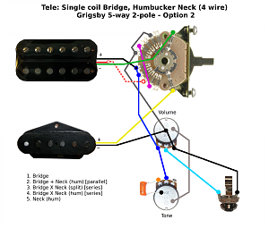 This is another cool wiring scheme that gives you all the traditional sounds plus something extra. Click diagram image to openview full size version. The two outside switch positions on the tele which select the bridge or neck pickup individually stay basically the same. 4 way wiring position 2 of the telecaster selector switch gives you both pickups wired in parallel. We sell tapped tele pickups individually and as part of the custom shop 53 tapped tele model t guitar shop set which includes a 5 way switch. The worlds largest selection of free guitar wiring diagrams.