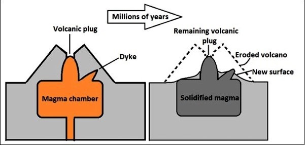 Rocks formed by the cooling of lava above the surface are called igneous rocks. Glacial erosion can lead to exposure of the plug on one side while a long slope.